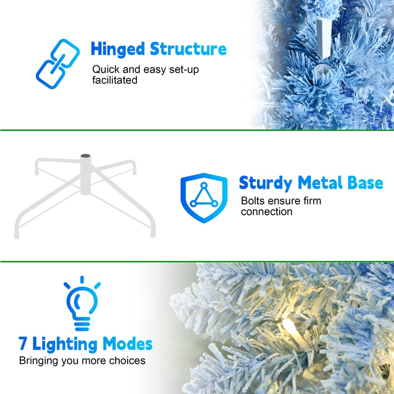 Home > Pencil Christmas Tree Snow Flocked Hinged Artificial Xmas Tree With Gradient Blue Leaves Branch Tips With LED Warm White Lights