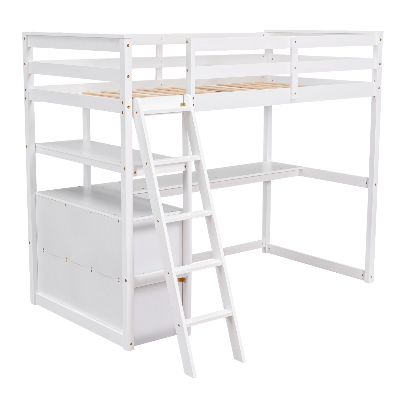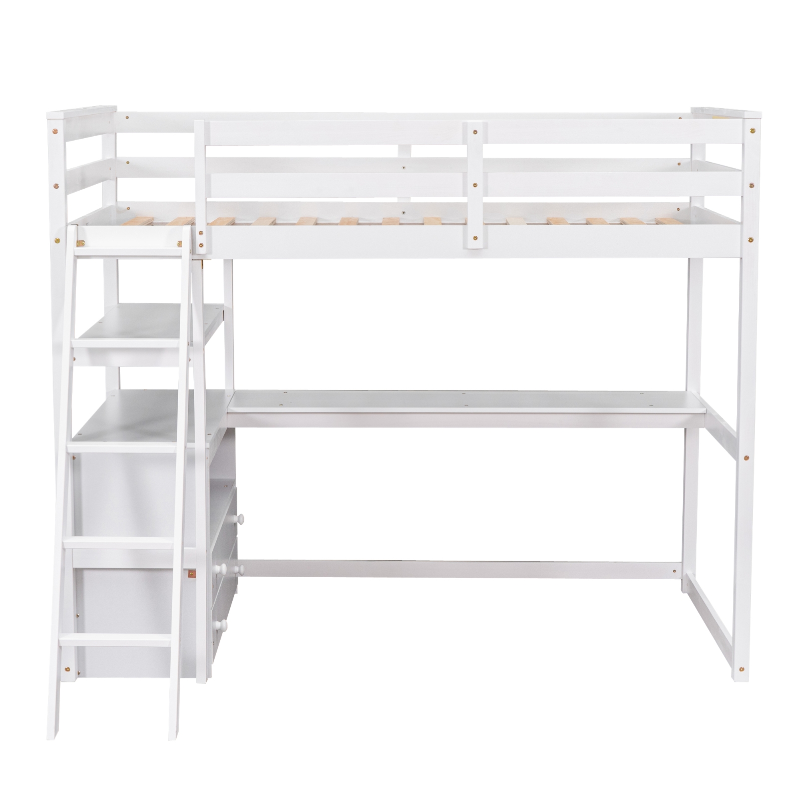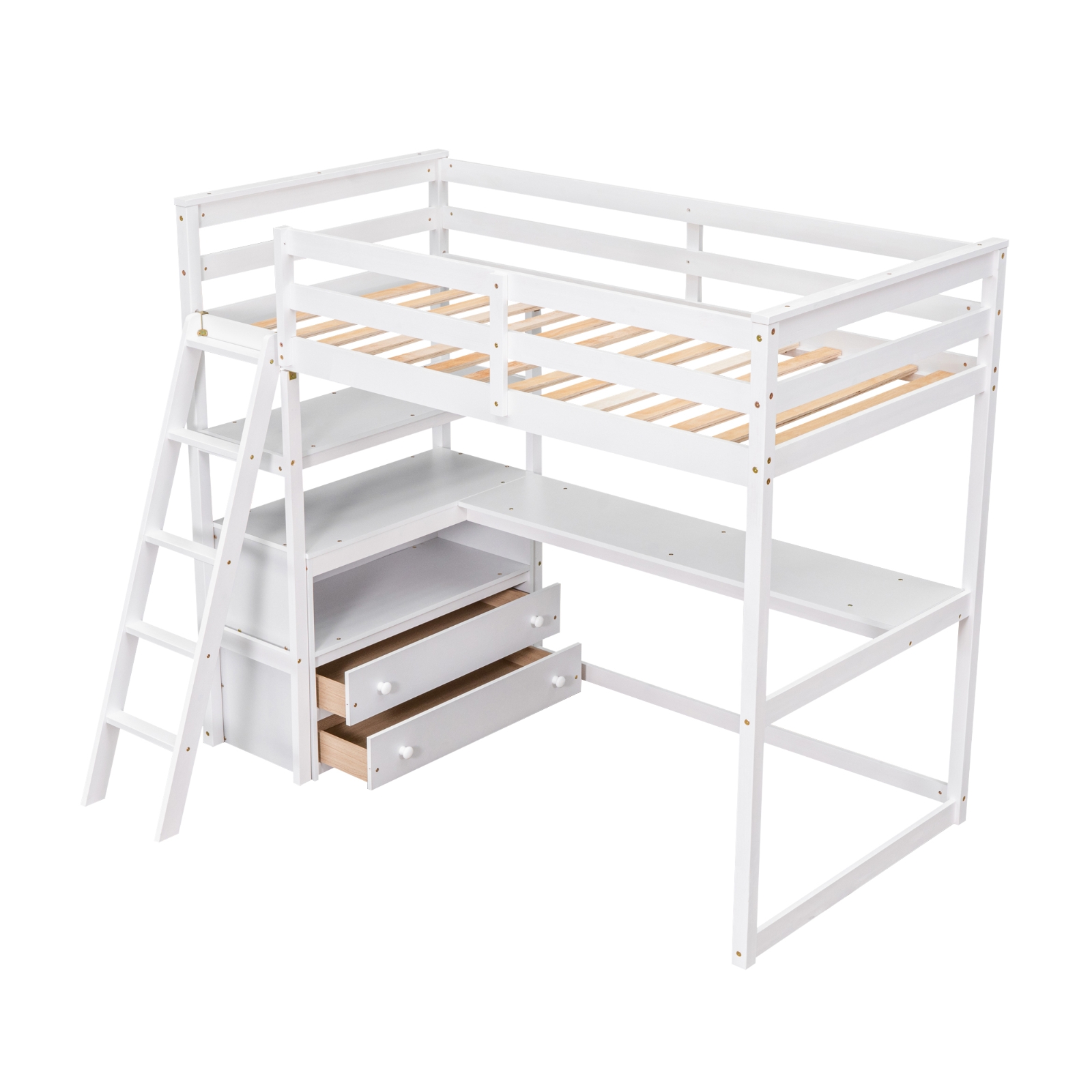 Twin Loft Bed With Desk, Shelves, 2 Drawers - White